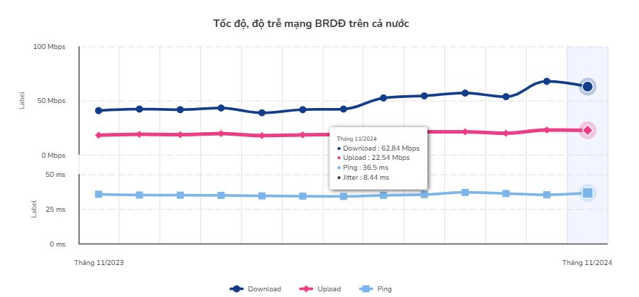 Ghi nhận dữ liệu mới nhất từ hệ thống đo tốc độ truy cập Internet i-Speed, tháng 11/2024, tốc độ Internet băng rộng di động tải xuống (download) trên cả nước trung bình là 62,84 Mbps, giảm 4,94 Mbps so với tháng 10/2024.