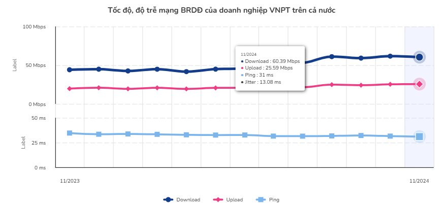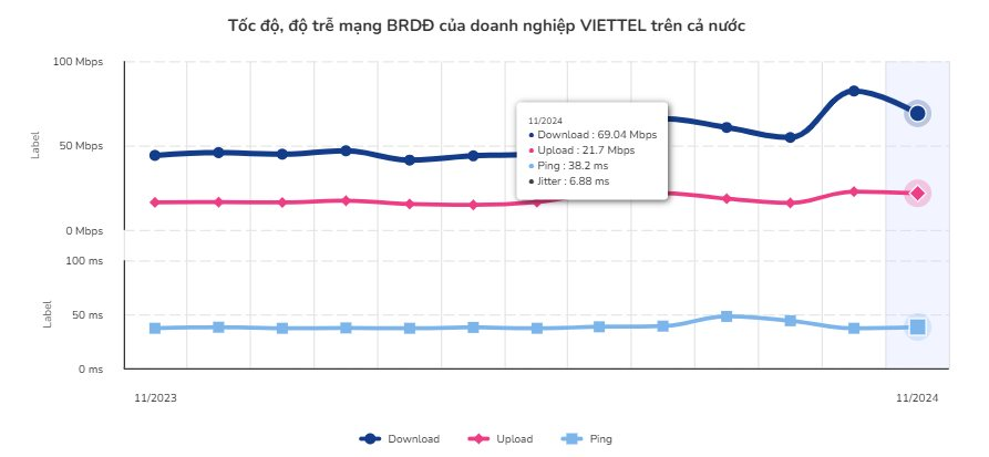 Xếp ở vị trí thứ hai là nhà mạng Vinaphone, với tốc độ Internet tải xuống là 60,39 Mbps, giảm 1,26 Mbps so với tháng 10/2024.